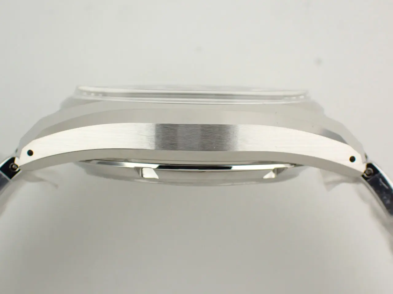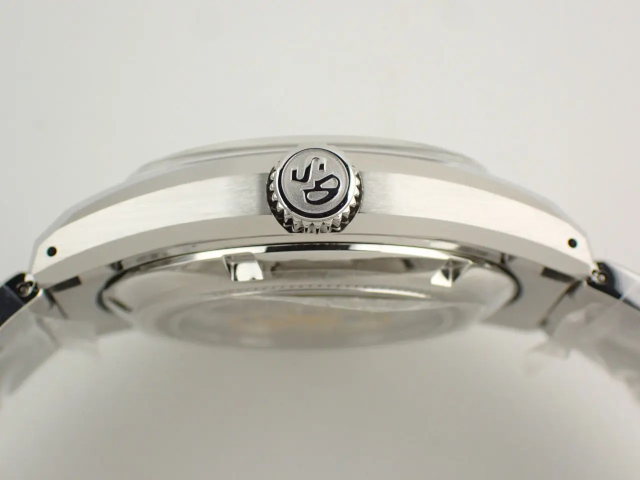 こちらは、2025年2月発売モデル。人気の二十四節気シリーズです。ダイヤルはネイビーカラーに、独特のパターンが敷かれて表情豊かな仕上がりです。ロゴと秒針はゴールドカラーで、夜空に輝く月光を想起させます。丸みを帯びてベゼルの無いケースは、過去の名機62GSをリファインしたもの。優美な一本となっています。