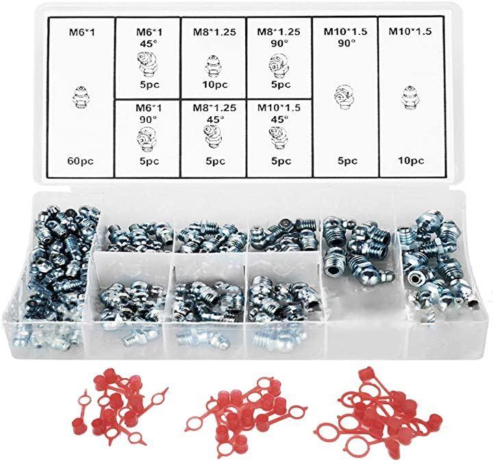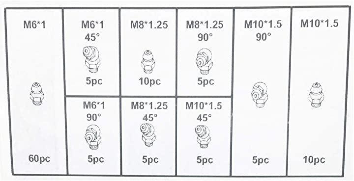 ・「セット内容」 M6x1=60pc ,M6x1(45°)=5pc,M6x1(90°)=5pc ,M8x1.25=5pc ,M8x1(45°)=10pc ,M8x1(90°)=5pc ,M10x1.5=10pc,M10x1.5(45°)=5pc ,M10x1.5(90°)=5pc ,グリスニップルカバー:M6=10個,M8=10個,M10=10個