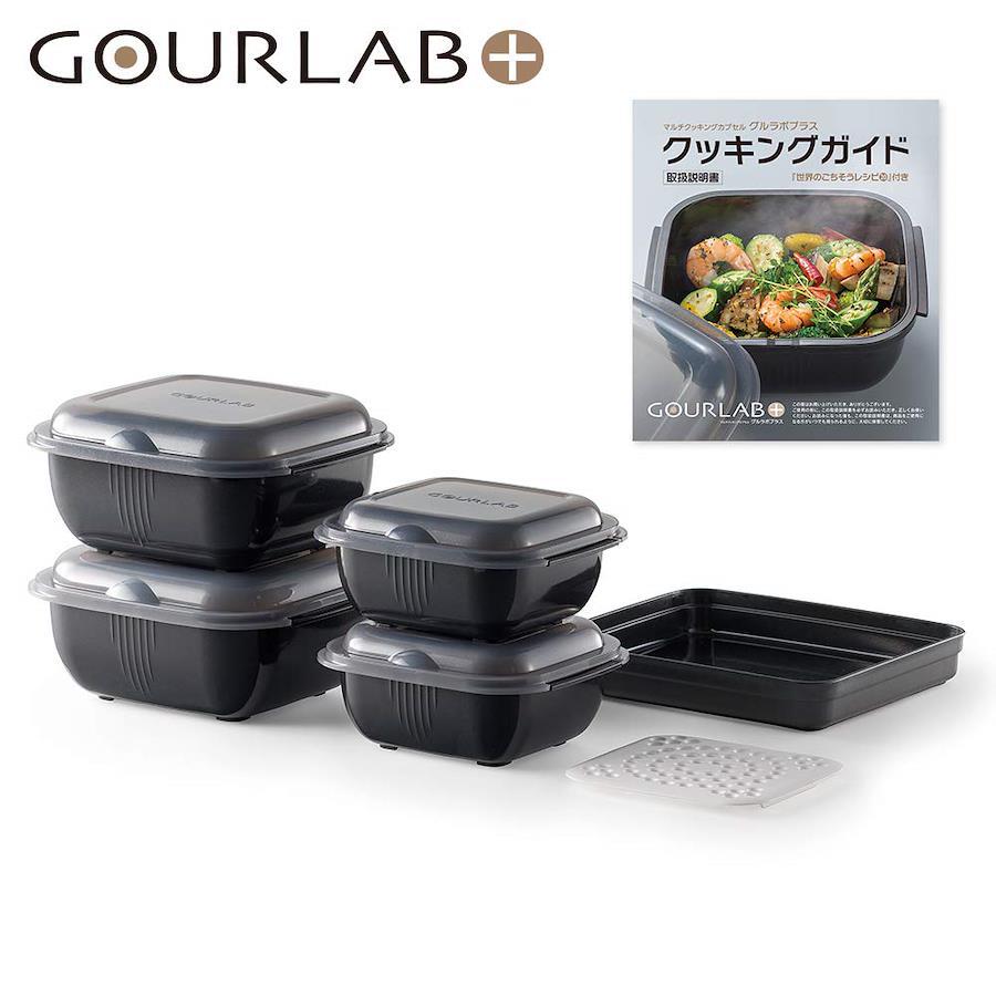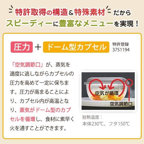 商品内容:ラージカプセル×2個、スモールカプセル×2個、スクエアディッシュ×1個、マルチプレート×1個、クッキングガイド×1冊ラージカプセル (外形寸法/重さ/容量):幅18.8×奥行16.7×高さ8.9cm/161g/1,320mlスモールカプセル (外形寸法/重さ/容量):幅15.6×奥行13.7×高さ7.2cm/107g/670mlスクエアディッシュ (外形寸法/重さ/容量):幅19.9×奥行18×高さ3.2cm/118g/900ml、マルチプレート (外形寸法/重さ):幅13×奥行12×高さ1cm/22g素材:[容器の本体/スクエアディッシュ/マルチプレート] シンジオタクチックポリスチレン・[容器のフタ] ポリプロピレン、耐熱温度:[本体] 230℃・[フタ] 150℃