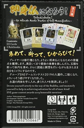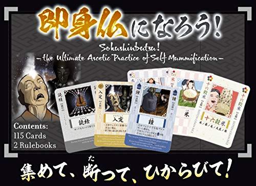 通常1-5営業日で発送【新品未開封品】発売後即完売したグループSNEゲームコンテスト2019入選作が第2版となって登場です。 プレイヤーは修行僧となって最も過酷な修行と呼ばれる即身仏に挑戦し、 菩薩点を得てよりよいミイラになることを目指します。 実際の修行内容をなぞった「五穀集めフェイズ」「五穀断ちフェイズ」「土中フェイズ」を経ることで、修行僧たちはミイラに近づきます。 手番に行うアクションはゲームを通してほぼ同じですが、フェイズごとに目的が違うため、 途中でプレイ感が大きく変わる新感覚カードゲームとなっています。 後半になればなるほど苦しい選択を迫られる様は、まさに究極の荒行である即身仏そのもの。 1版からパッケージも一新し、より遊びやすく一部ルールを調整している本作。 諸行無常のプレイ感をぜひ遊んでみてください。 プレイ人数:2-5人 プレイ時間:20-30分 対象年齢:10歳以上 ゲームデザイン:猫柳生 イラスト:石野中