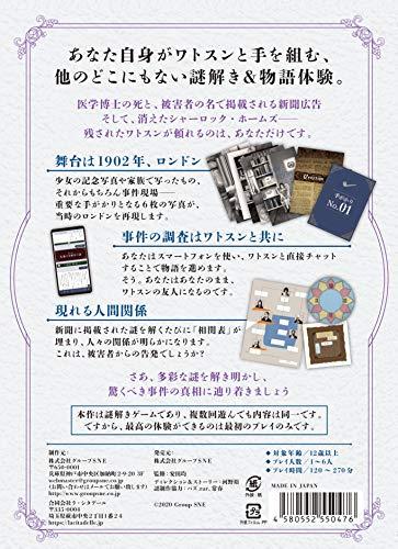 謎解きと物語の完全な融合を目指した、ESCALOGUE(エスカローグ)シリーズ第2弾。 第2作のテーマは「ホームズ」、舞台は1902年のロンドン。 発端は「奇妙な新聞広告」――ある医学博士が毎日出稿している「暗号の文面」でした。 それらが8枚たまったとき、実はその博士が10日も前に亡くなっていたことが判明します。 興味を持ったワトソンはベーカー街221Bを訪ねますが、そこにホームズの姿はありませんでした……。 この奇妙な事件の真相は? ホームズはどこに消えたのか? 残されたワトソンと共に、真実を明らかにするのはあなたです。 なお、本作にはLINEアプリをインストールしたスマートフォンが必要です。 またゲームの性質上、最高の体験ができるのは一度だけとなりますのでご注意ください。 プレイ人数:1~6人 プレイ時間:120~270分 対象年齢:12歳以上 ディレクション&ストーリー:河野裕 謎制作:パズ.rar、常春 イラスト:青依青 制作:グループSNE、ラ・シタデール