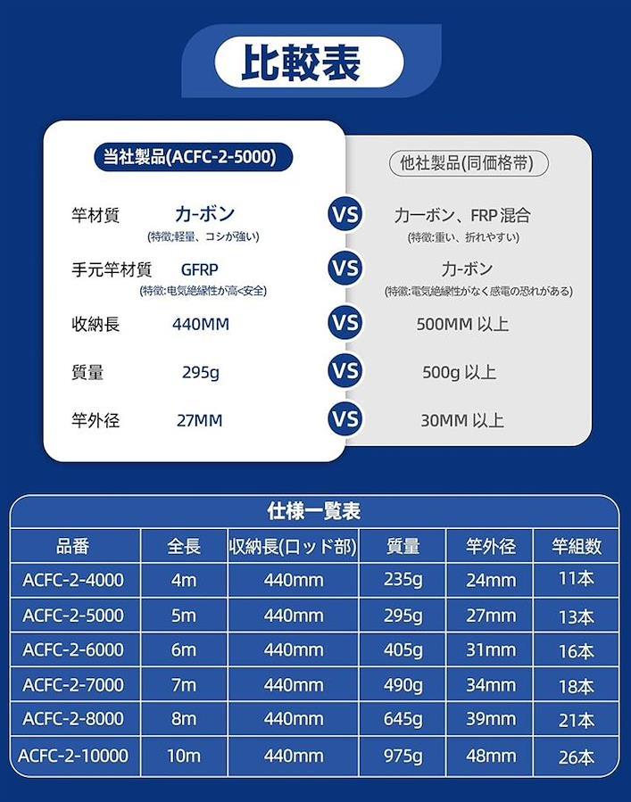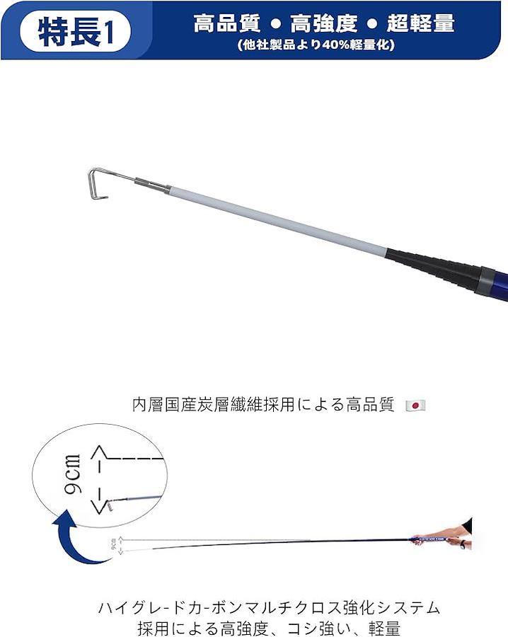 ・ブランド:AURORE ・メーカー:オーロレ興業(AURORE KOGYO) ・素材:ハイグレードカーボンマルチクロス強化システム ・手元竿素材:GFRP ・伸長時長さ:5m ・収納時長さ(ロッド部):44cm ・質量:295g ・竿外径:27mm ・竿組み数:13本 ・手元竿先端部:蓄光塗装 ・フック金具:ステンレス製、Ⅿ5ネジ ・口金・尻金:アルミ合金製「ご使用時のご注意」