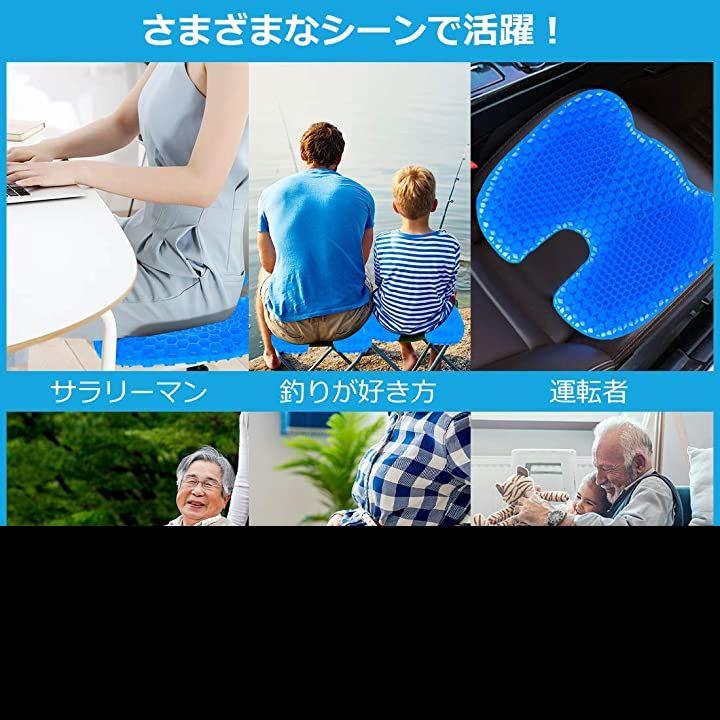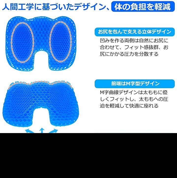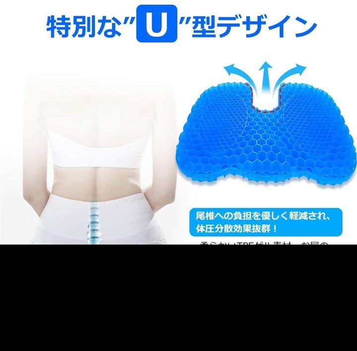 ・「ユニークなU形デザインゲルクッション」特別なU型構造で尾てい骨など弱い部位を避け、従来のジェルクッションよりもたらす尾椎の圧迫感という欠点を改良しました。