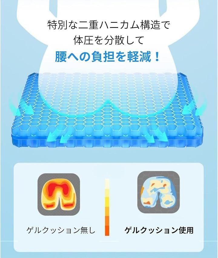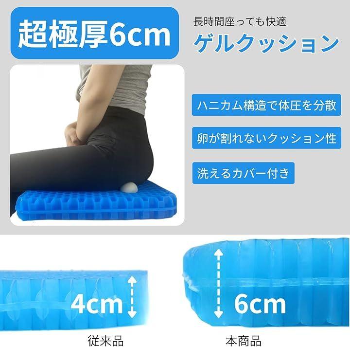 「超極厚6cm」ハニカム構造で通気性と体圧分散に優れ、長時間座っても快適なゲルクッションです。