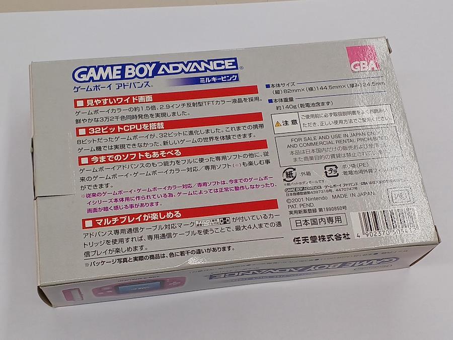 ■備考カラー:ミルキーピンク。希少な箱付きゲームボーイアドバンスです!GB/GBAソフトが楽しめます!付属品:箱、説明書。状態:箱日焼けしています。本体の外観にキズあります。特に右側面に削れ箇所あります。