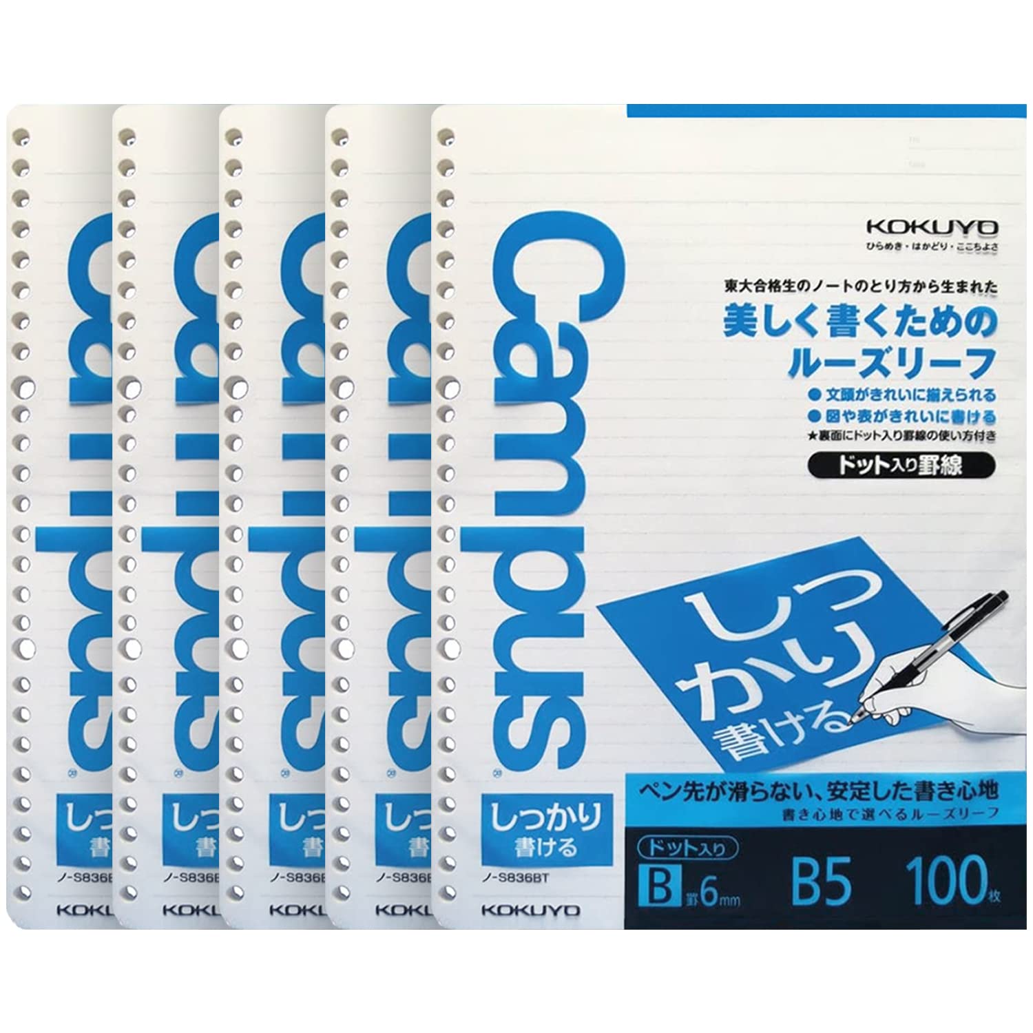 ●「美しく書く」をサポートするドット入り罫線/罫線上に等間隔に並んだドットを活用することで、ノートを美しく書くことができ、書いた後見返しやすく、効率的に学習することができます。●試験勉強のまとめ用として便利なルーズリーフです。●裏面にドット入り罫線の活用法が記載されています。●書き心地で選べる/筆記時の力の強さや筆記速度、よく使う筆記具などにより、好みに合わせて「さらさら書ける」タイプと「しっかり書ける」タイプの2種類の書き心地から選べます。●使いやすく工夫した罫内容/キャンパスノートと同じようにタテ線が正確に引けるよう、センターと左端に三角形のメモリ点を配置しました。●筆記に最適なオリジナル原紙/「さらさら」「しっかり」どちらの原紙もにじみにくく、インクが裏に透けにくいコクヨオリジナル原紙を使用しています。また、長期保存に適した中性紙です。●紙質/上質紙●紙厚/77g/m2・0.12mm程度●丸穴●寸法/タテ257×ヨコ182