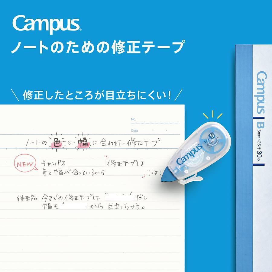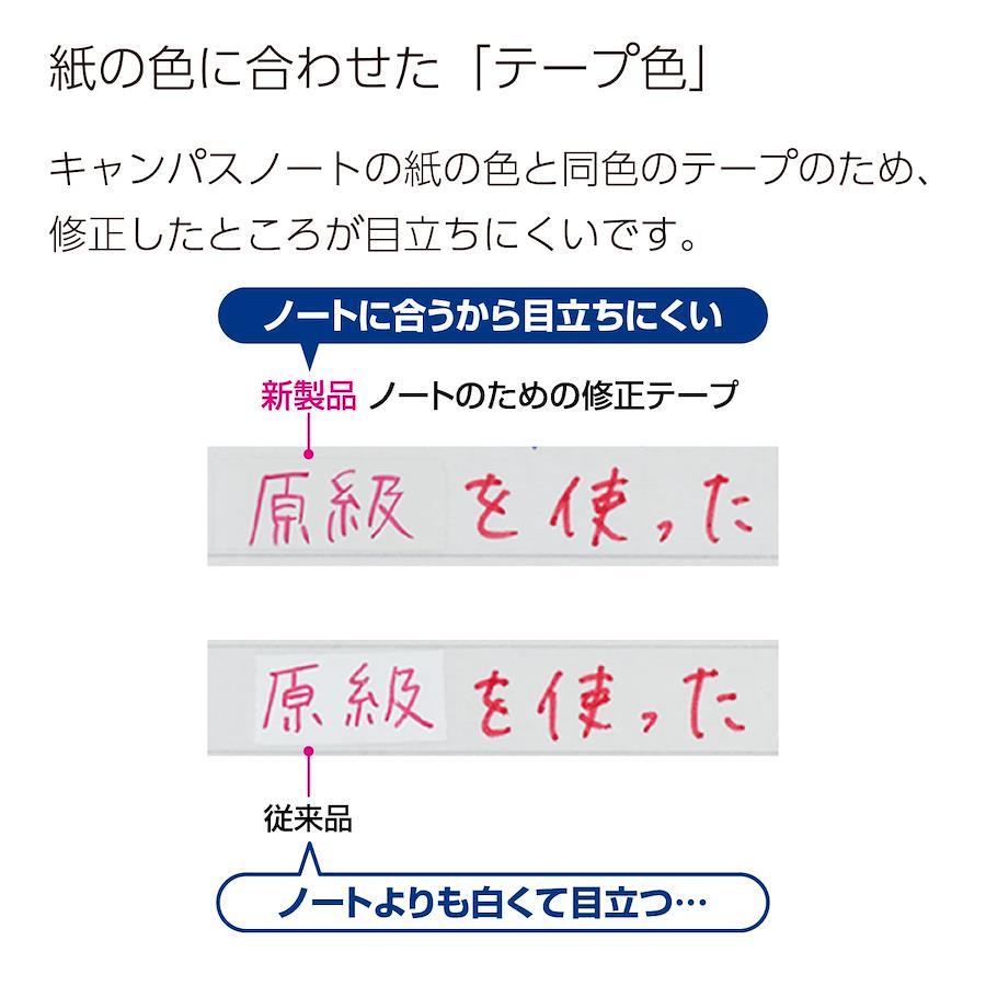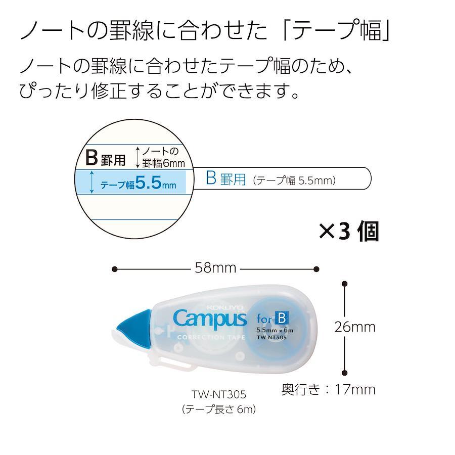 ■■消したところが目立たない、ノートのための修正テープ3個パック■■●キャンパスノートの紙の色と同色のテープのため、修正したところが目立ちません。●ノートの罫幅に合わせたテープ幅のため、ぴったり修正することができます。●テープの定着性が良く、きれいに切れる、メタルプレート搭載ヘッドを採用。商品仕様●寸法/58×26×17mm●種類/B罫用、使い切りタイプ●テープ寸法/幅5.5mm、長さ6m●テープ色/キャンパスノートの中紙の色●材質/ケース:R-ABS・ABS