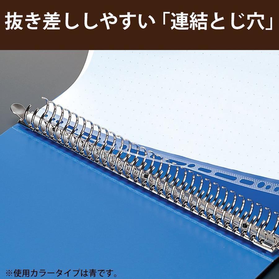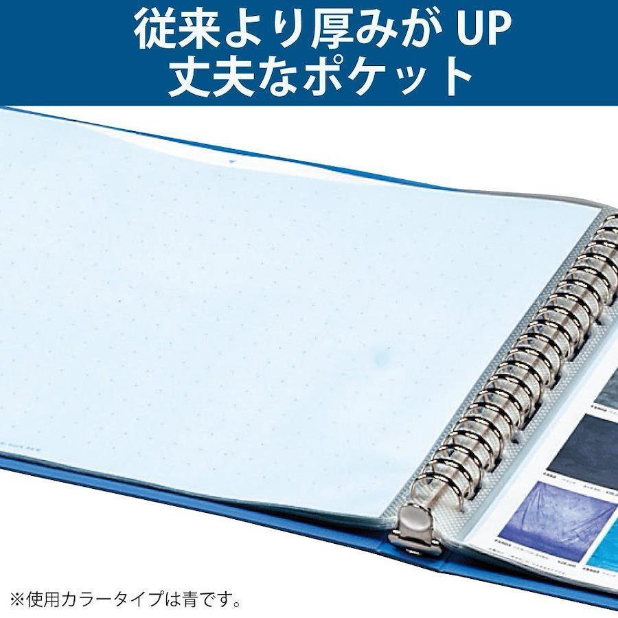環境に配慮したリベット付きでとじ具を外すことができ、廃棄時に分別可能です。中身を落としても開かないロック付きリングとじ具(スーパーロック)を採用。丈夫なポケット。従来より厚みが約40%UP。ポケット中紙は、表紙に合わせた色展開です。リング内径/17mm 穴数/30穴 表紙/発泡R-PP50% ポケット/R-PP40%