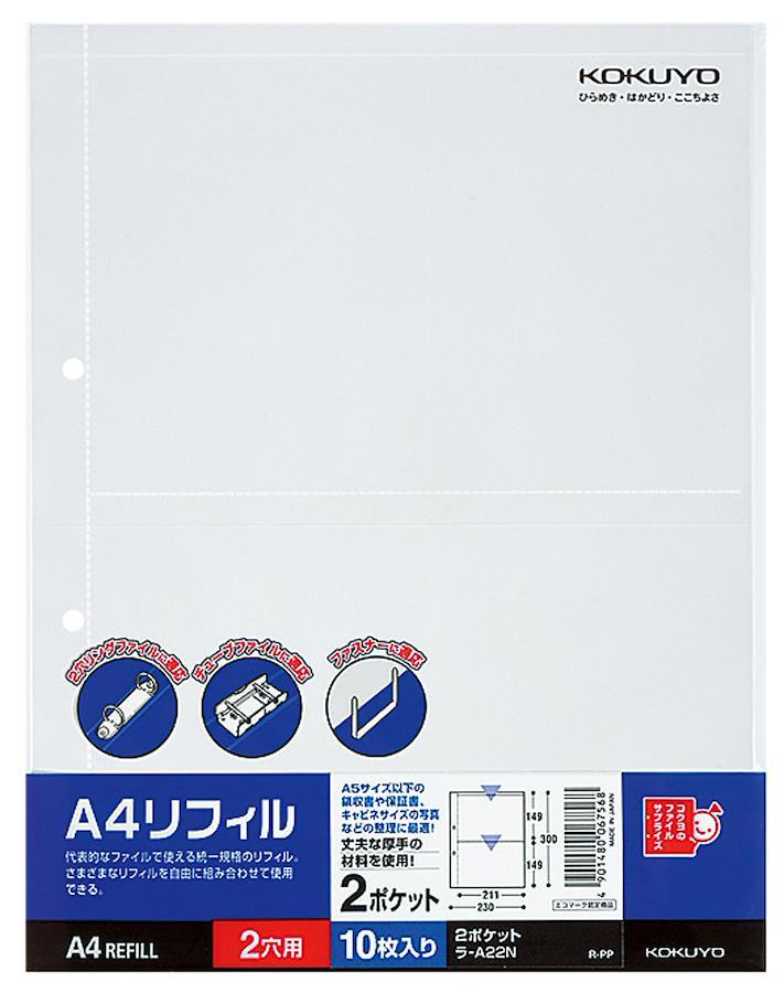 一般的なチューブファイル・フォルダー・替紙式クリヤーブックにぴったり収まる2ポケットシートです。2穴ファイルと合わせて利用すれば、自分だけのオリジナルファイルが作成できます。チューブファイル内で、一般書類と一緒にとじることもできます。