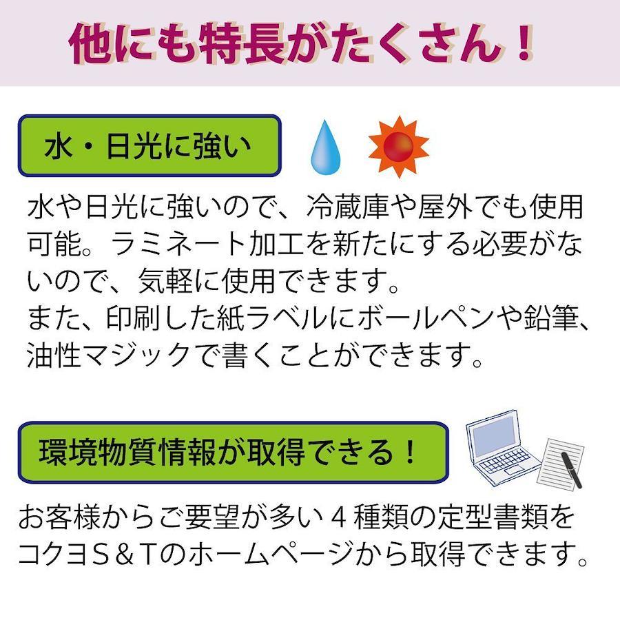 ●耐水・耐久性に優れたラベルなので、水に濡れても大丈夫。室内の水まわりの表示ラベルや値札のほか、屋外掲示などに最適です。●手書きでもお使いいただけます。(水性インクを除く)