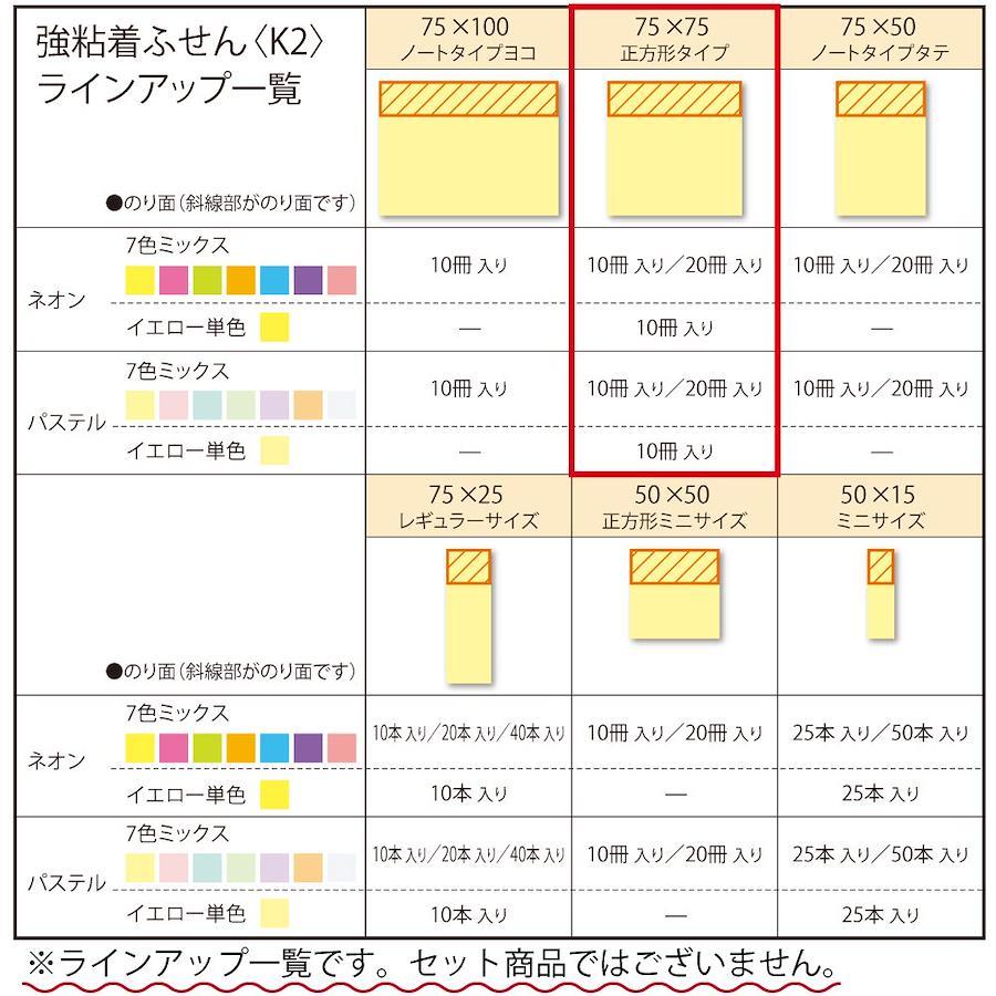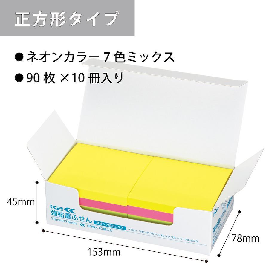 商品仕様●サイズ:正方形サイズ/75mm×75mm●枚数:90枚×10冊入り●ネオンカラー7色ミックス●強粘着タイプ●ふせん紙質:色特殊紙●紙箱入り
