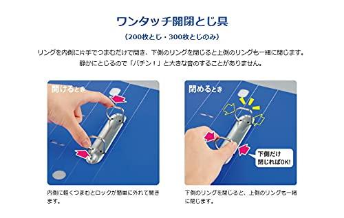【商品説明】●ワンタッチ開閉/リングを内側に片手でつまむだけで開き、下側のリングを閉じると上側のリングも一緒に閉じます。●しっかりロック/綴じ具がしっかりかみ合っているので、書類が抜け落ちる心配がありません。●閲覧モード/表紙をロックした閲覧モードでは、書類の紙めくりをスムーズに行うことができて、パンチ穴が傷みにくくなります。(従来のDリングファイルとの比較)●セミワイド表紙/通常のリングファイルよりもワイドな表紙サイズで、クリヤーポケットを綴じてもはみ出さずに使えます。●引き出し収容/コンパクトなとじ具の設計なので、デスクの引き出しにも収納可能です。●替え背紙式●背紙抜き出しホール/背紙の抜き出しをサポートする背紙抜き出し穴付きです。●フィンガーホール付き/棚からスムーズに取り出すことができます。●紙押さえ付き/紙押さえで書類を抑えることできます。●表紙ロック/表紙をロックをすると棚に並べた時に自立することができます。●内ポケット/穴をあける前の書類を一時保管できる内ポケット付きです。●綴じ枚数/200枚※ファイルの収容枚数の表示は、PPC用紙64g/m2を使用し、収容寸法1mmあたり10枚で算出しております。そのため、紙の種類によっては必ずしも計算通りにならない場合がありますので、一応の目安としてご利用ください。※クリヤーポケットのサイズによっては、表紙からはみだす場合がございます。