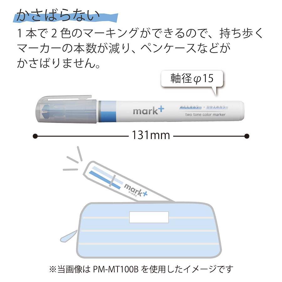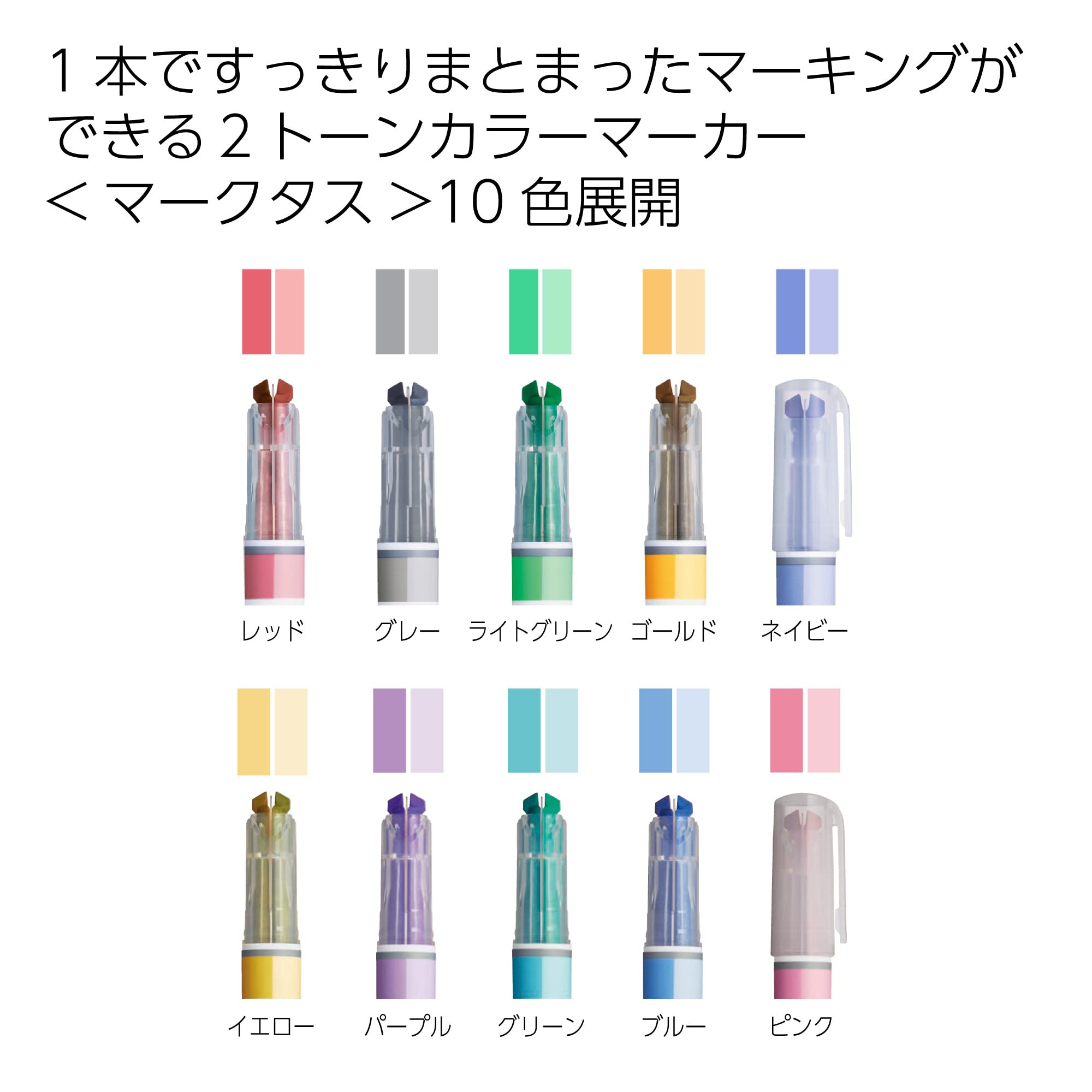 ■■スッキリまとまるマーキングペン マークタス■■・同系色のインクなので、2色使ってもスッキリまとまったマーキングができます。・トーンの異なるめだたせカラーとひかえめカラーを重要度に応じて塗り分けすることで、メリハリのついたマーキングができます。・マーキングしても目がチカチカしにくいインク色を採用しています。・1本で2色のマーキングができるので、ペンケースがかさばりません。