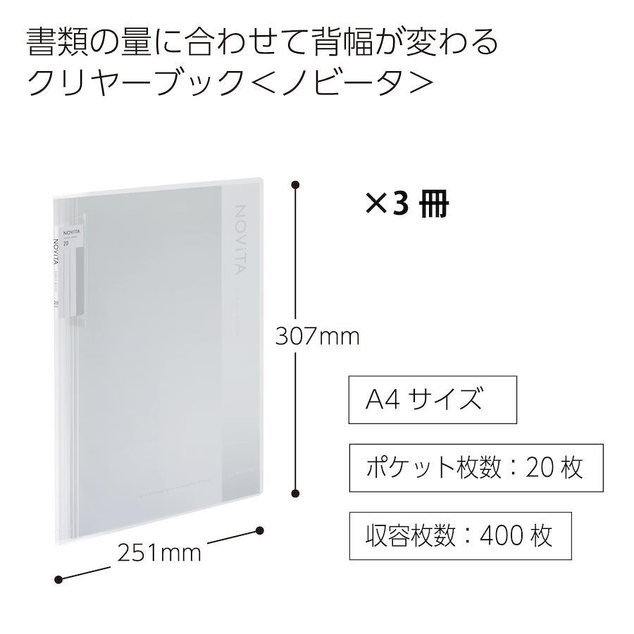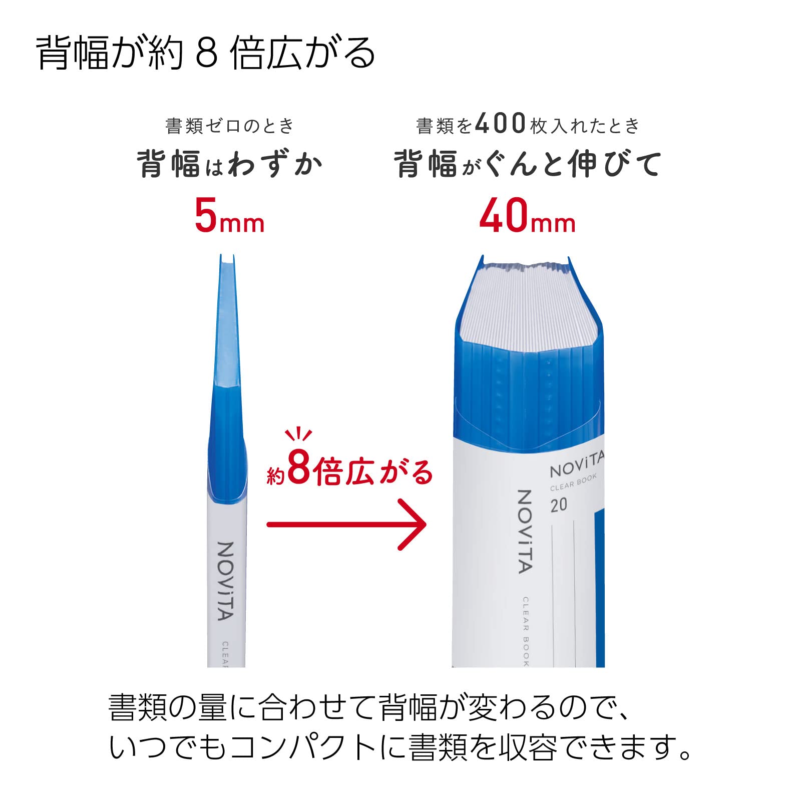 ■■書類の量に応じて背幅が変わるノビータクリヤーブックの3冊パック■■・書類の量に合わせて背幅が変わるので、いつでもコンパクトに書類を収容できます。・書類が少なくても背幅がかさばらず、無駄なスペースを作りません。使い始めから、コンパクトに保管できます。・大量の書類を入れても、書類が丸まることなくすっきり収容。ファイルが膨らまないので、表紙もぴったり閉じることができます。※背幅が広くなった場合、外寸法の幅は少し小さくなります。