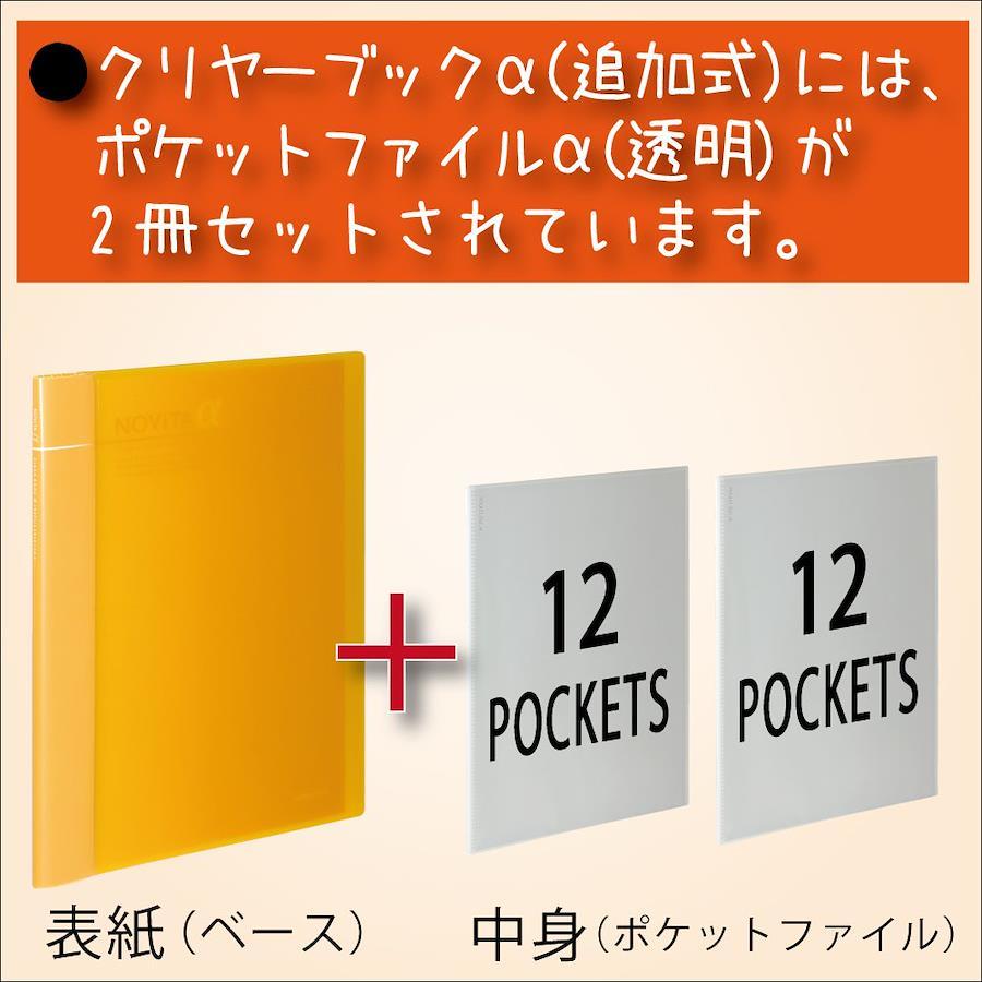 ●用途に合わせて追加・入れ替えが自由にできる追加式のクリヤーブックです。●同シリーズのファイルαを差し込んで使えるので自分仕様のファイルを作ることができます。●セット内容は、表紙となるクリヤーブックα(表紙色:黄色)に、中身となるポケットファイルα(カラー:透明、ポケット枚数:12枚)が2冊です。●収容量によって背幅が変わります。●ひとつのクリヤーブックαにセットできるファイルαは6冊までです。