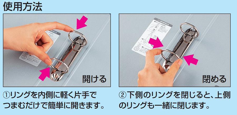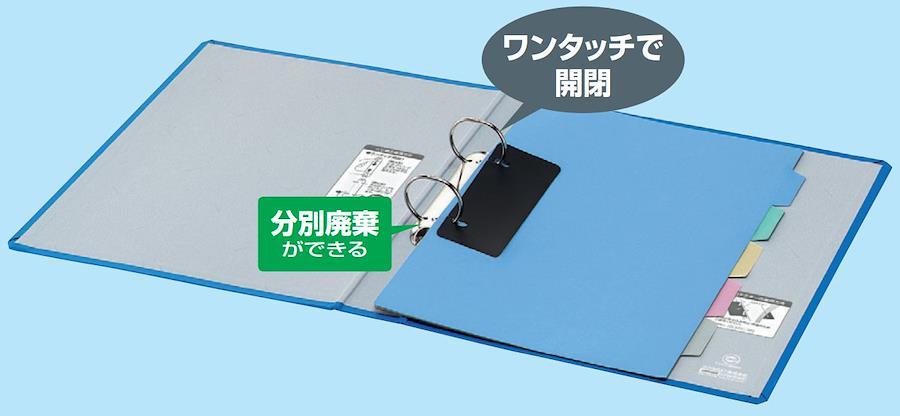 ●ワンタッチで開閉する金属とじ具を使用した張り表紙のリングファイルです。