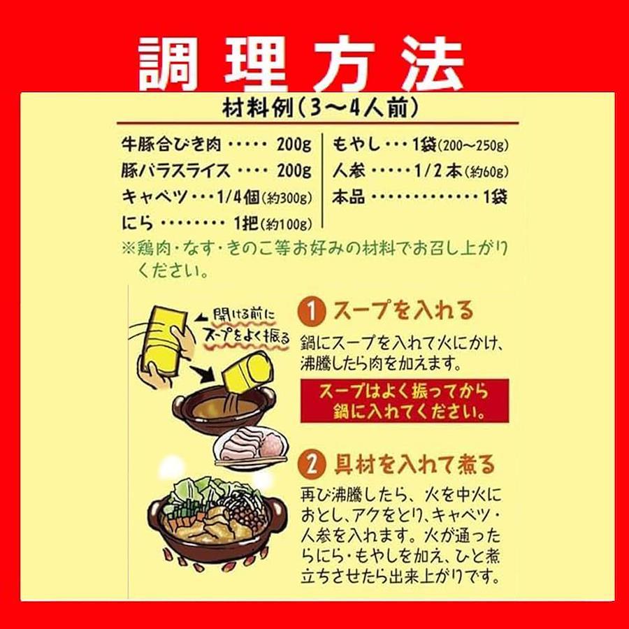 1、スープを入れる鍋にスープを入れて火にかけ、沸騰したら肉を加えます。※スープはよく振ってから鍋に入れてください。2、具材を入れて煮る再び沸騰したら、火を中火におとし、アクをとり、キャベツ・人参を入れます。火が通ったらにら・もやしを加え、ひと煮立ちさせたら出来上がりです。