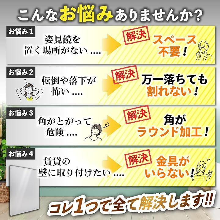 「皆様のお悩み解決」姿見を置く場所がない、落下して飛散するのが怖い、とがった角でけがをしそう、賃貸住宅に壁掛け鏡を設置したいけどできない、などお悩みと不安を解決する理想のミラーです。
