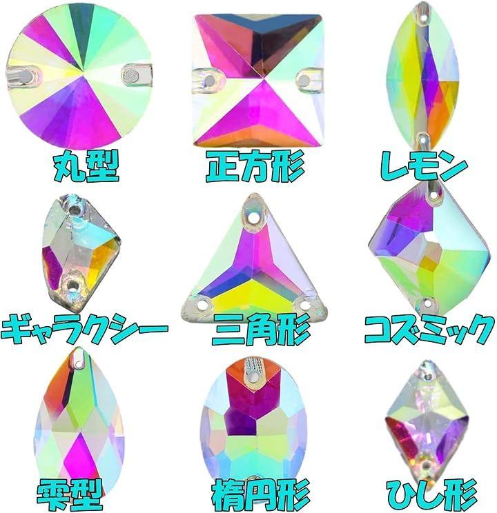 「素材」ガラス「色」AB彩、オーロラ 「タイプ」ソーオン、縫い付け用両端穴2つ「形状」コズミック型 「販売単位」各サイズ別トレー1つで販売(トレー内の個数はサイズ別)
