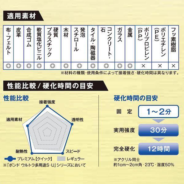 ●硬化時間目安:固定1~2分→実用強度30分→完全硬化12時間(※アクリル同士約1cm~2cm角.23℃・湿度50%)