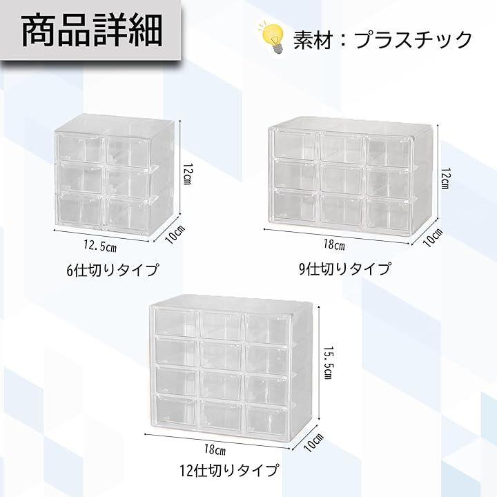 「商品詳細」6仕切りタイプ:12.5cm x 10cm x 12cm、9仕切りタイプ:18cm x 10cm x 12cm、12仕切りタイプ:18cm x 10cm x 15.5cm、素材:プラスチック