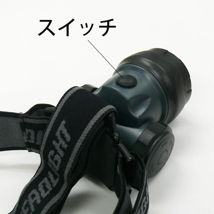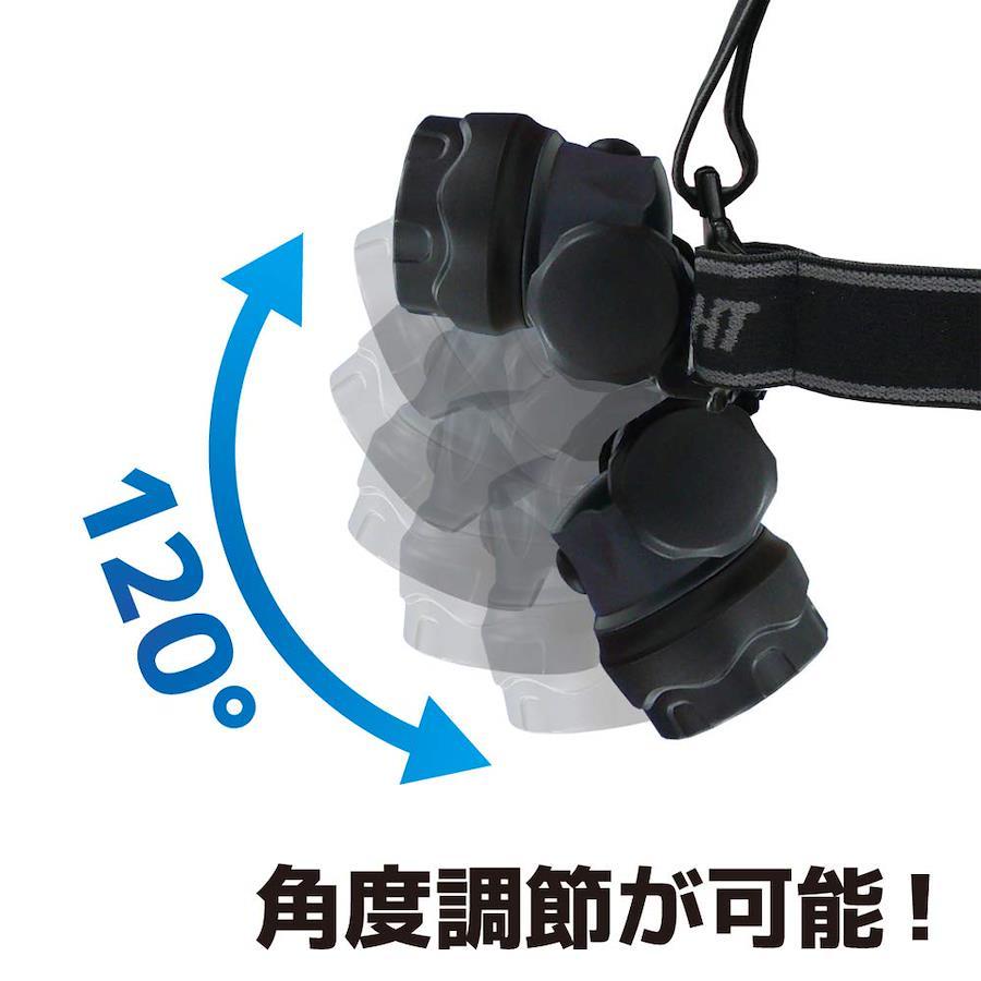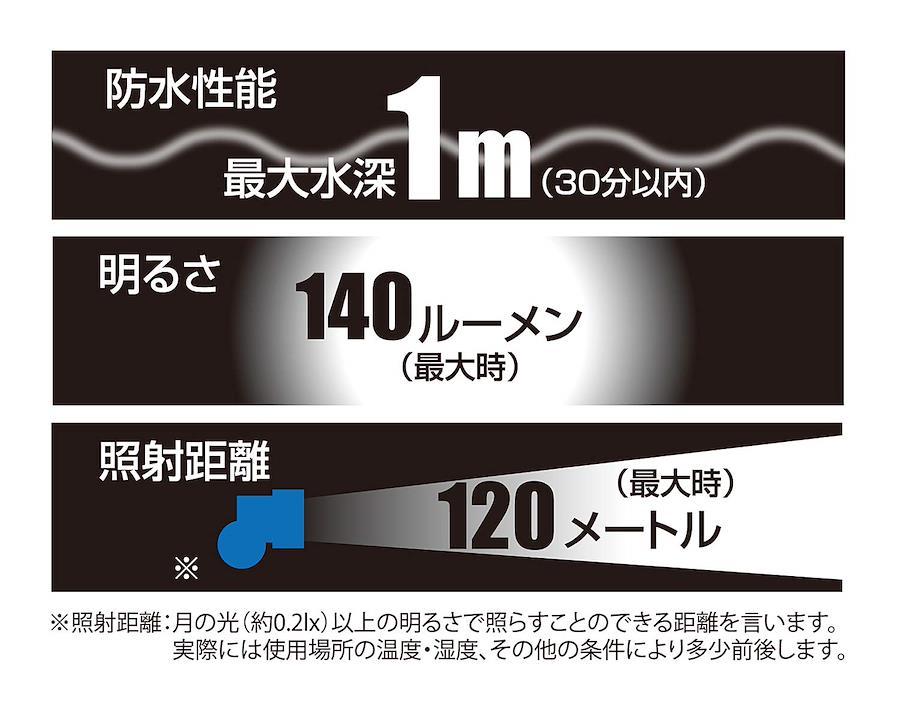 水深1mでも耐える防水仕様のヘッドライトです。伸縮性のバンド付きで、付属のアタッチメントによりヘルメットにも装着可能です。サイズ(mm):70×55×63(ベルトを除く) 重量(g):60(ベルト・電池を除く)電源:単4アルカリ乾電池×3本(別売)光源:cree高輝度白色チップ型LED×1灯明るさ:(Highモード時)約140ルーメン、(Lowモード時)約40ルーメン実用点灯時間:Highモード時/約6時間、Lowモード時/約24時間