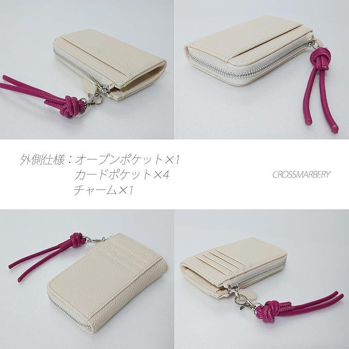 「素材」合成皮革 「仕様」開閉:ファスナー、内側:オープンポケットx1、キーチェーンx1、外側:オープンポケットx1、カードポケットx4、チャームx1 「サイズ」横幅:13.5cm、高さ:8.5cm、マチ:2.5cm 「重さ」約100g