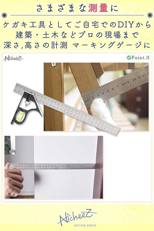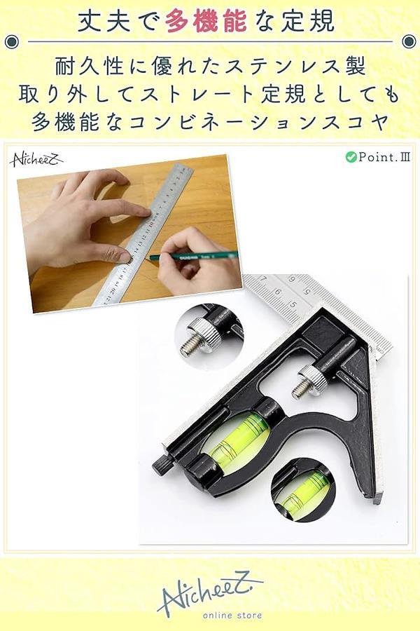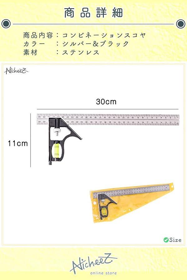 「商品内容」コンビネーションスコヤ セット数:1個 素材:ステンレス カラー:シルバー&ブラック サイズ:30cmx11cm 重さ/約131g