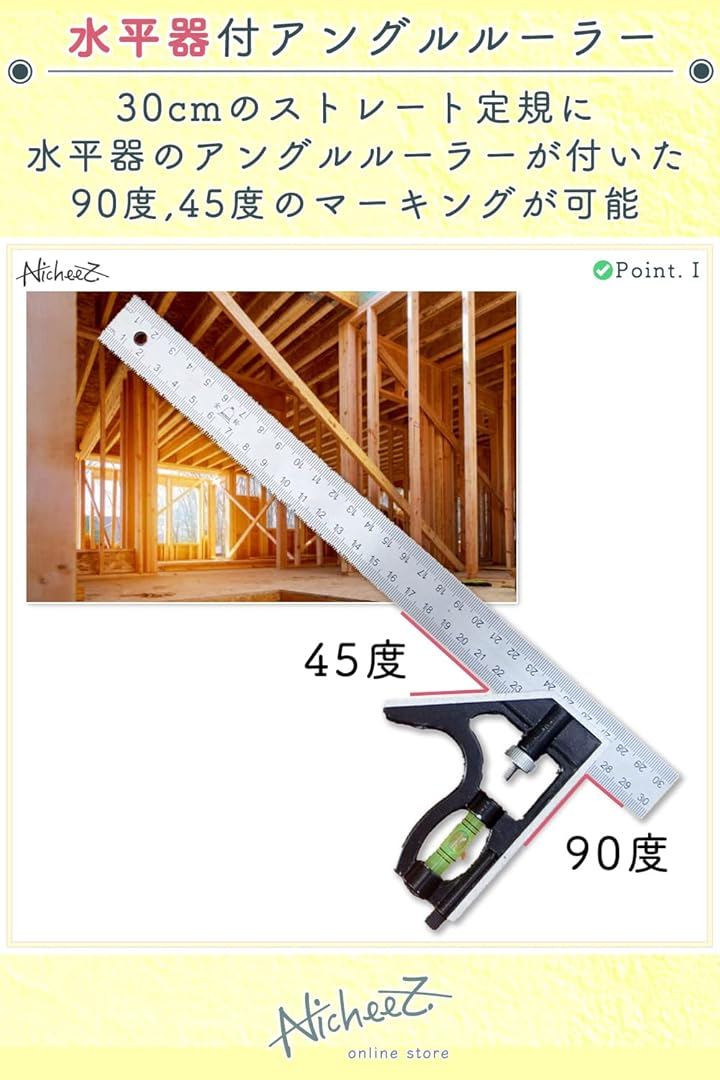 「水平器付アングルルーラー」30cmのストレート定規に水平器付きのアングルルーラーが付いた90度/45度の角度マーキングができる直角定規。