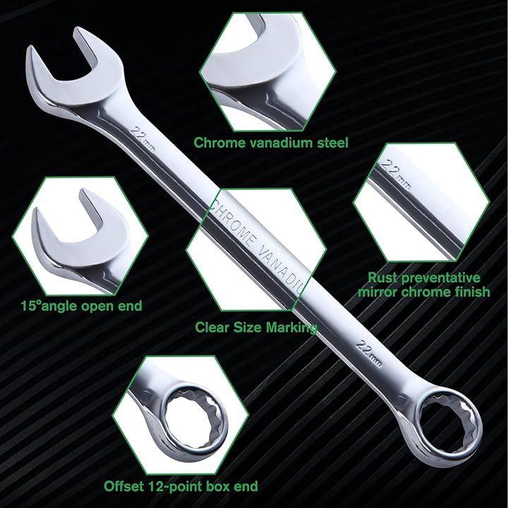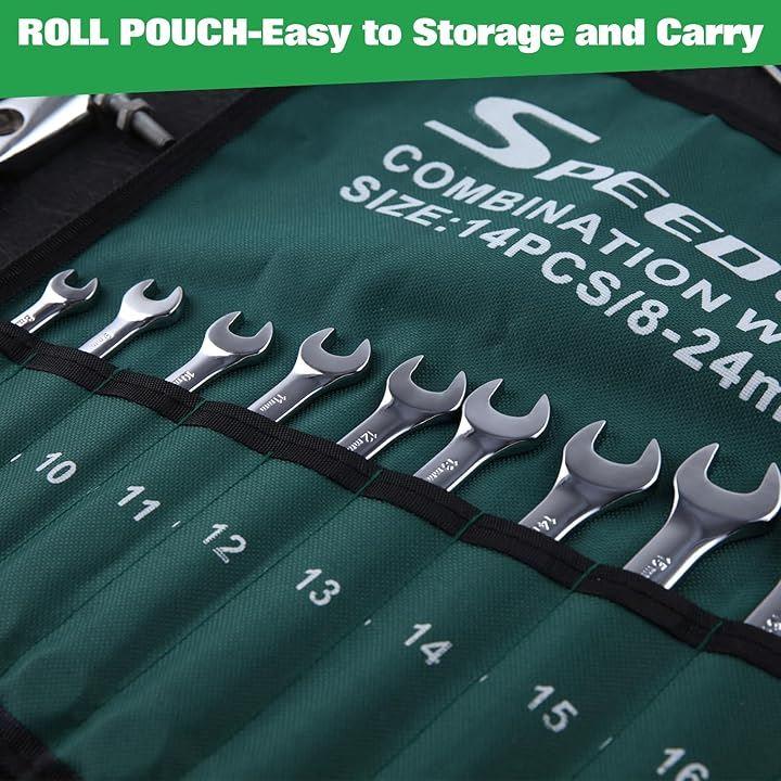 「セット内容」8、9、10、11、12、13、14、15、16、17、18、19、22、24mmの異なるサイズの両用スパナ14本と収納袋がセットになっており、日常使いに便利な複数のサイズ、収納袋は整理、収納、携帯に便利です。