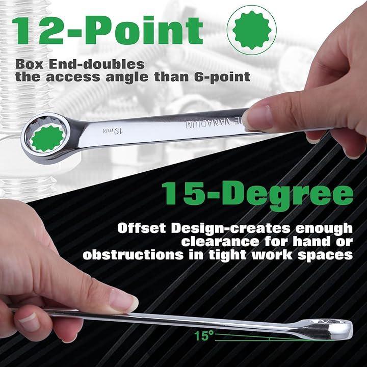 「プラムスパナ」12ポイントの設計は、一般的な6ポイントの設計よりもアプローチ角度を2倍にし、15°の傾斜角度は、狭い作業スペースで手や障害物のために余裕を残すように設計されています。