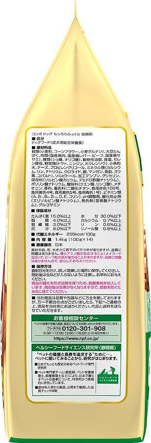 ○国産鶏肉をたっぷり使用したオリジナル製法のもちふわ仕上げ。○しっとり仕上げのお肉具材をトッピング。飽きのこないおいしさに仕上げました。○おいしさはそのまま、脂肪分約20%カット!(コンボ ドッグ もっちりふっくら 国産チキン・しっとりビーフ添え 比)〇関節の健康維持にグルコサミンを配合○もちふわ食感がいつでもおいしい、100gの新鮮超小分け!○100g×14袋入り。○小粒。○成犬用総合栄養食。