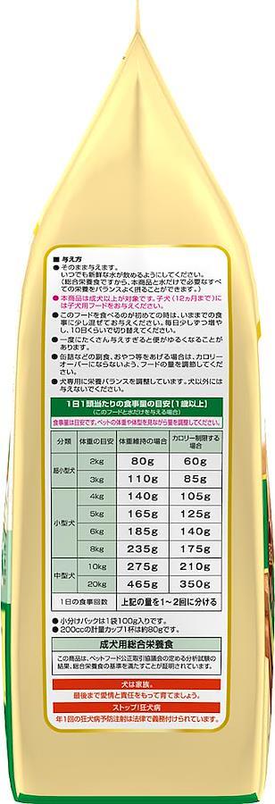 たんぱく質15.0%以上、脂質4.0%以上、粗繊維3.0%以下、灰分8.0%以下、水分30.0%以下、カルシウム0.7%以上、リン0.6%以上、リノール酸0.8%以上