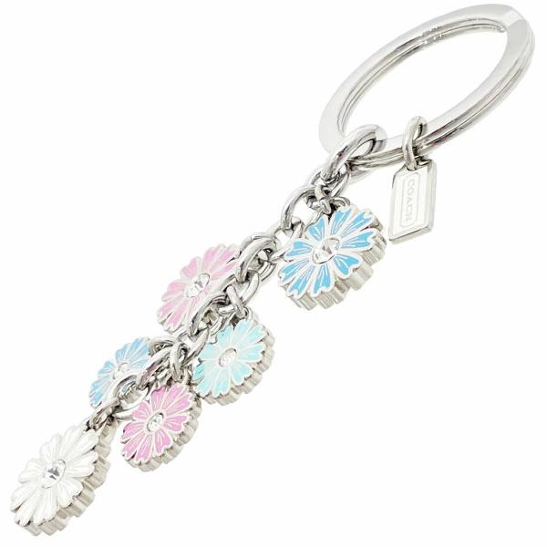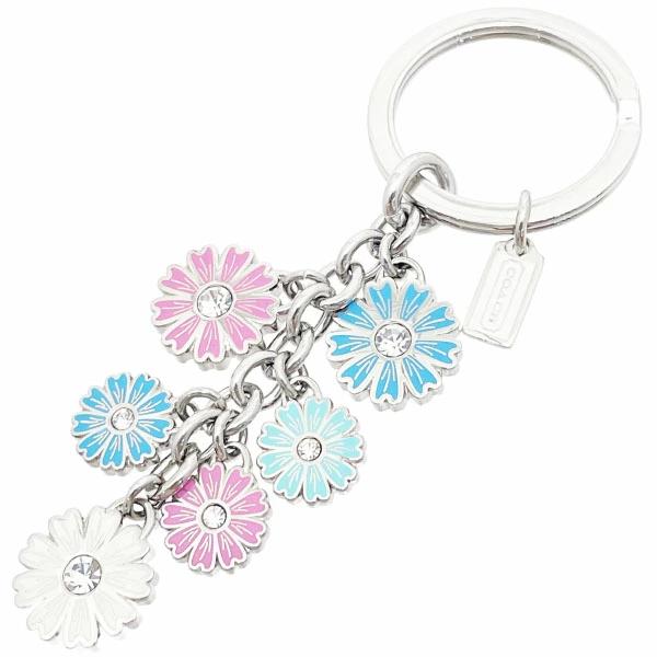Pre-owned Coach flower key fob with rhinestones and metal accents in multicolor, pink, blue, white, and silver hardware. This flower motif key ring charm can be used as a bag charm, key charm, key hook, or other brand-name accessory.