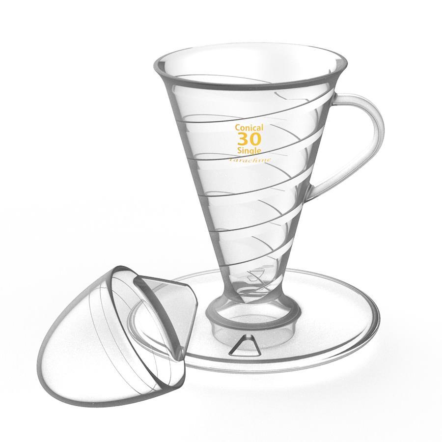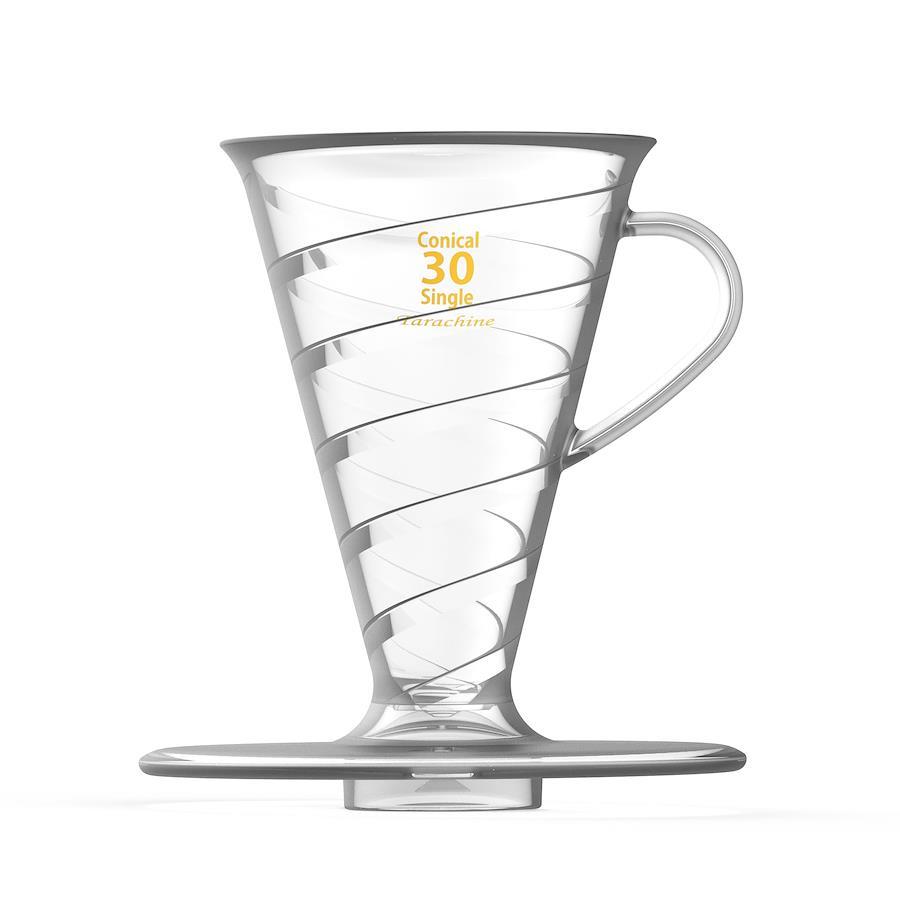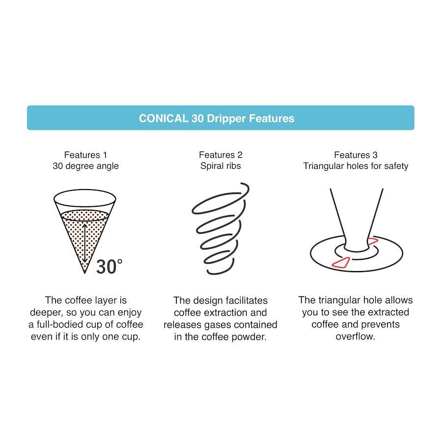 縦約11センチの円錐形ドリッパーで円錐の角度が30°と急角度。 この30°という角度によりドリッパー内のコーヒー層が深くなるため、 1杯分でもコクのあるコーヒーを抽出することができます。