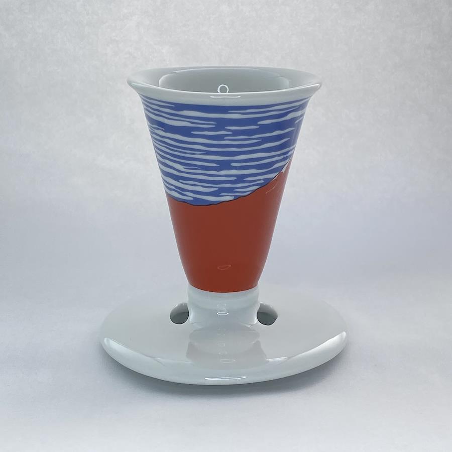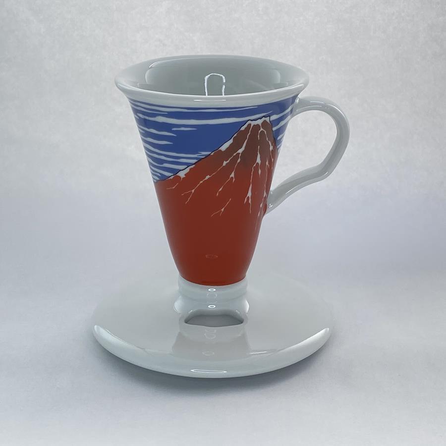 有田焼のCONICAL30コーヒードリッパーで葛飾北斎の赤富士(Red Fuji)がデザインされています。縦約11センチの円錐形ドリッパーで円錐の角度が30°と急角度。 この30°という角度によりドリッパー内のコーヒー層が深くなるため、 1杯分でもコクのあるコーヒーを抽出することができます。