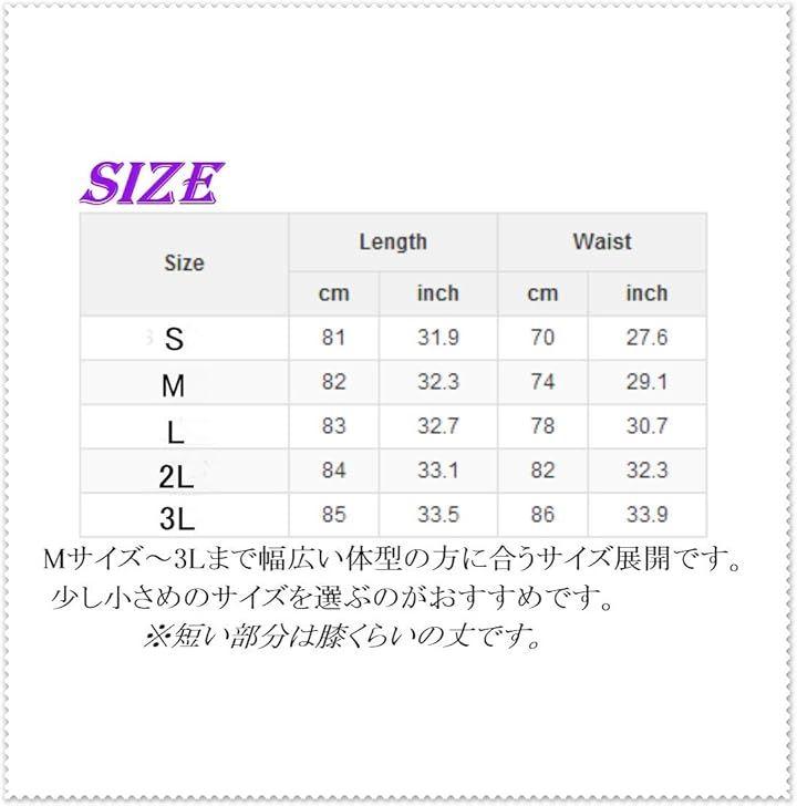 「サイズ(約)」S 丈:81cm ウエスト:70cm M 丈:82cm ウエスト:74cm L 丈:83cm ウエスト:78cm 2L 丈:84cm ウエスト:82cm 3L 丈:85cm ウエスト:86cm 短い部分は膝くらいの長さです