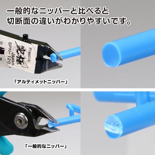 アルティメットニッパーは、ゲートカットに特化して「究極の切り口」を追求したプラスチック専用片刃ニッパーです。3mmほどのランナーをスライスカットしてみると、スルスルと刃が入っていき、ほとんど音もなく切り終わります。切れ味がいいので、デザインナイフで削いだような滑らかな切断面を得られ、プラスチックの白化 (断面が白くなってしまう現象)を最小限に抑えます。一般的なニッパーに比べると切断跡が断然きれいなので、プラモデルを塗装せずに完成させたい人にもオススメです。アルティメットニッパーの驚異的な切れ味を生み出しているのが、薄く研ぎ澄まされた「切刃(きりば)」 と、よりきれいに切るための「片刃構造」です。【各部の機能】開き過ぎ防止ピン:刃の開き過ぎでバネが外れるのを防ぎます。刃折れ防止ストッパー:力の入れすぎで刃が折れるのを防止します。※対応素材:プラスチック (PS樹脂、PP樹脂、ABS樹脂、PE樹脂)のみ切断可。※切断能力:3mm以下の対応素材のみ切断可。ただし透明・半透明のPS樹脂は硬いため、1mm以下に限定※切れ味を重視した繊細なニッパーですので、使い方を誤ると刃が欠けたり折れたりすることがあります。※取扱説明書の注意事項を守ってご使用ください。[セット内容]本体、ニッパーキャップ プラスチック模型のゲートカットに特化し、究極の切れ味を追求した極薄片刃ニッパー 主な製造国 :日本 仕様:全長約120mm、重さ約60g、片刃構造 対応素材:プラスチック (PS樹脂、PP樹脂、ABS樹脂、PE樹脂)のみ切断可 切断能力:Φ3mm以下の対応素材のみ切断可。ただし透明・半透明のPS樹脂は硬いため、Φ1mm以下に限定