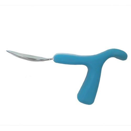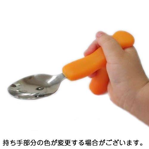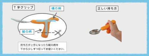 T字グリップにより、持ち方が安定します。鉛筆や箸の操作につながる手指機能の発達を促します。持ち方が上手になったら、縦の柄を短くして一般のスプーンに近づけることができます。食洗機が使用できるので衛生的です。親指は必ず横の柄の上になるようにしてください。下になるとスプーンの先が左右に動いてコントロールしにくくなります。