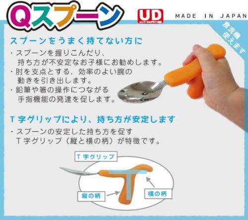 スプーンの安定した持ち方を促すT字グリップ(縦と横の柄)が特徴です。T字グリップにより、持ち方が安定します。Qスプーンは肘を支点とする、効率の良い腕の動きを引き出し、鉛筆や箸の操作につながる手指機能の発達を促します。握りやすいので、スプーンを握りこんだり、持ち方が不安定なかたにお勧めします。親指を横の柄の上にのせ、人差し指で横の柄を支えます。中指から小指で縦の柄を握ります。すくいやすい皿を併せて使用すると効果的です。【使用上の注意】・形が複雑な為に、正しい持ち方が分からない場合があります。使い始めや正しく持てない場合は、大人の方や専門家が正しい持ち方を教えてあげてください。・親指は必ず横の柄の上