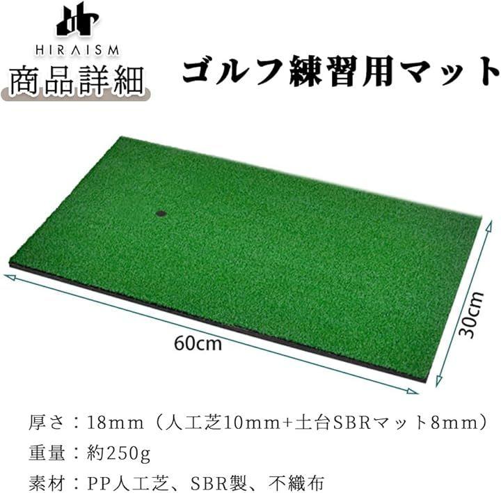 「商品内容」ゴルフ練習用マット 縦30cmx横60cmx厚さ18mm(人工芝10mm+土台SBRマット8mm) 550g グリーン PP人工芝、SBR製、不織布 *到着時、ポリプロピレン (PP)製特有のゴム臭がしますが、梱包から取り出し、一晩放置して頂くと臭いは気になりません。