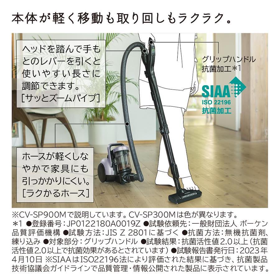 ●強力パワー 吸込仕事率290W(消費電力840W)「高性能小型ファンモーター」が吸込仕事率290Wの強い吸引力を生み出し、フローリングの溝やじゅうたんのごみもしっかり吸い取ります。強い吸引力でもやさしい運転音59dBです。また、吸い込んだ空気を効率よく加速させて発生した力強い旋回気流で、ごみと空気を遠心分離するので、吸込力が99%以上持続します。さらに、空気の流れを利用してダストケース下部に集めたごみをしっかり圧縮する「からまんプレス構造」を採用。ダストケース内の遠心分離の中心となる内筒部分のフィルターに、髪の毛などがからまりにくくお手入れがラクです。●軽量ボディ2.5kgで移動や取り回しもラクラク本体質量2.5kgを実現した軽量ボディで、移動や取り回しもラクです。また、ホースとヘッドは軽く、パイプは細く、ラクにお掃除ができます。さらに、微細なごみも約99%逃がさない(※)きれいな排気です。※試験方法:大きさが0.3-10マイクロメートルの排出じんあい量測定。2020年度モデルCV-SP300H(同等性能)で測定。●「ごみくっきりライト」でごみを浮かび上がらせる「パワフルスマートヘッド」に「ごみくっきりライト」を搭載。もっとも明るく感じる波長に近い緑色のLEDライトで見えにくいごみも浮かび上がらせます(※)。また、「からまんブラシ」で髪の毛などがからまりにくく、すっきり吸引。お手入れもラクです(※)。さらに、「2アングル形状」の異なる角度のブラシでごみをしっかりかき出します。加えて、ヘッドの押し引きに合わせて後ろのフラップが開閉する「シンクロフラップ」により、押すときも引くときも吸うからごみの取り残しを減らします。※日立調べ。●軽い力でスイスイ前に進む「自走機能」●グリップハンドルは抗菌加工