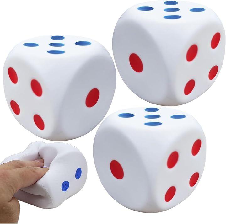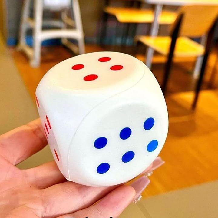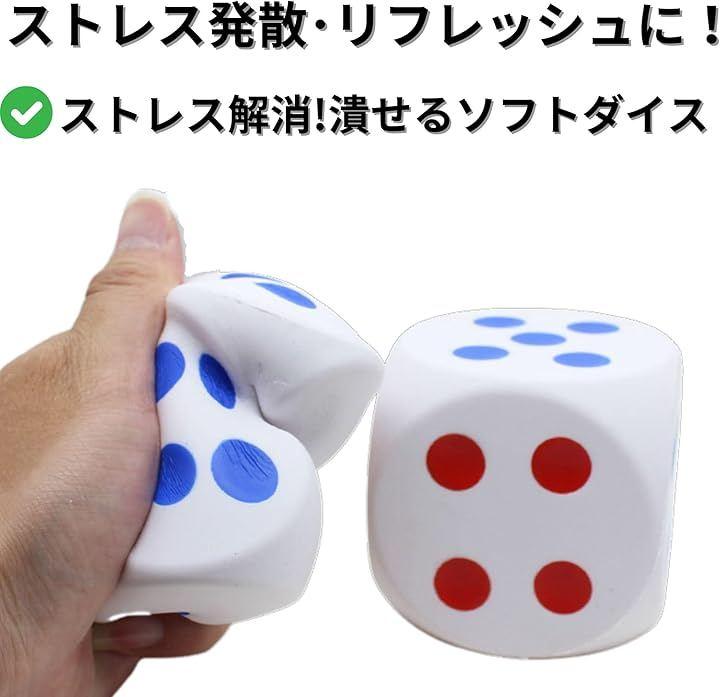 (ストレス解消に最適。潰せるソフトダイス)柔らかい素材でできたこのサイコロは、ぎゅっと握ると潰れて、すぐに元の形に戻るスローバック仕様。