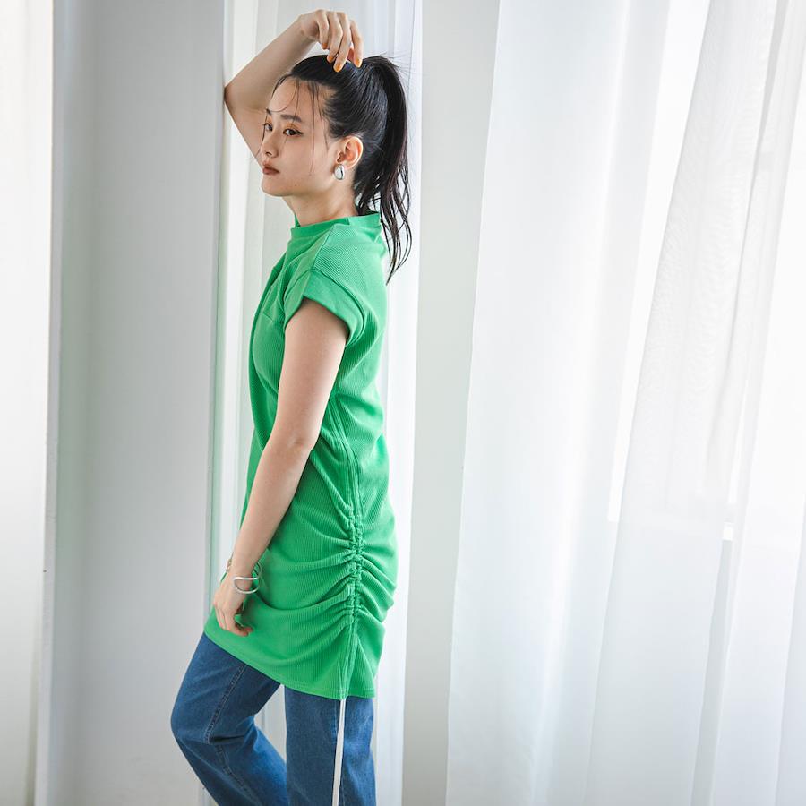 ボトムをレイヤードして着用する際には、ドロストを絞ってチュニック丈に。