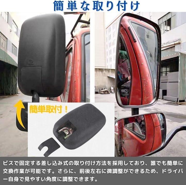 いすず エルフ、日産 アトラス、日野 デュトロ、マツダ タイタン、三菱ふそう キャンター、UDトラックス カゼット、トヨタ ダイナカーゴ、トヨタ トヨエースカーゴなど、多くの車種に使用可能で、交換用のサイドミラーとして、接触による破損や事故など緊急の際の予備用ミラーとしても非常に便利です。
