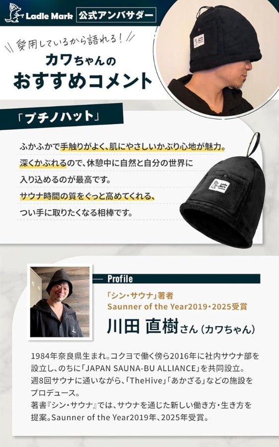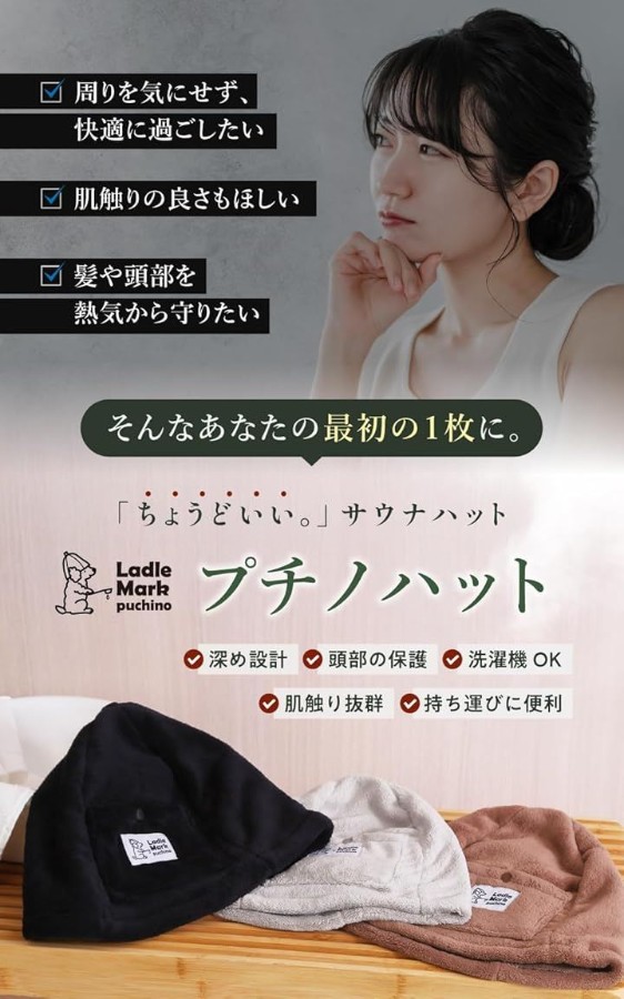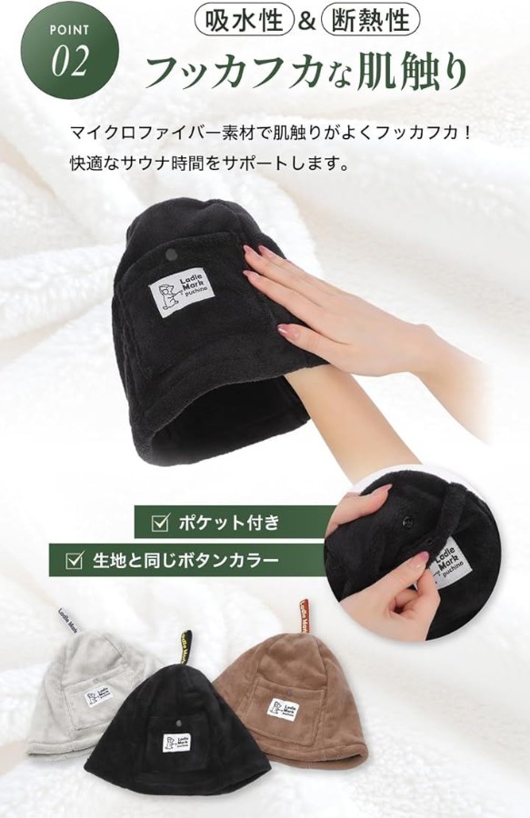 優れた断熱性と吸水性で、サウナの熱気から大切な髪の毛や頭皮、耳を優しく保護します。