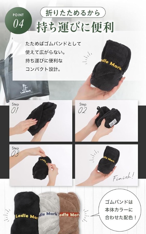 干す時に使うループがそのまま固定用のゴムバンドになる独自設計で、バッグの中で広がらずスマートに持ち運べます。