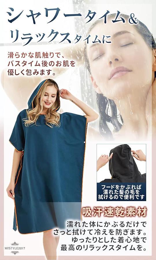 「肌ざわり」サウナポンチョはマイクロファイバー素材で肌割の良いタオルポンチョです。
