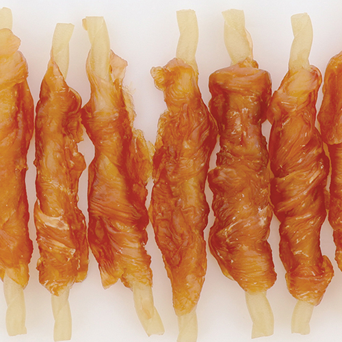 旨味たっぷりで味わい深い鶏ササミを2倍巻いた食べごたえ大満足のササミ巻きガム(ペティオ「ササミ巻きガム」比)。鶏ササミとガムの美味しさが味わえるスナックです。シニア犬にも食べやすいやわらか仕上げ。保存料・着色料不使用。農林水産省認定鳥加熱処理工場製造。