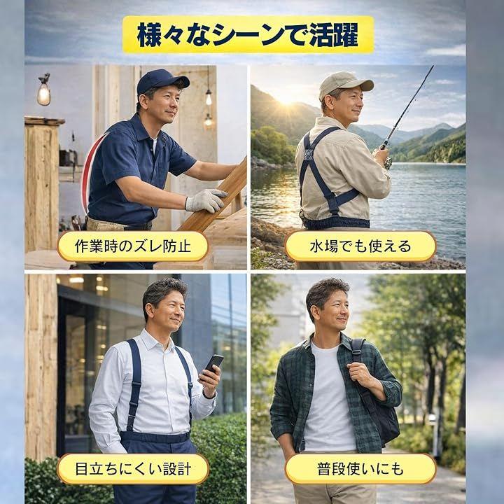 また、X型やY型のサスペンダーに比べて肩への負担が少なく、快適なフィット感を提供します。